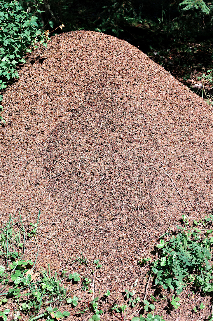§ The woman or man stands in front of an anthill in midsummer sunshine, whereupon the ants crawl in the shade onto the surface. Then the man or woman moves away and takes a picture.